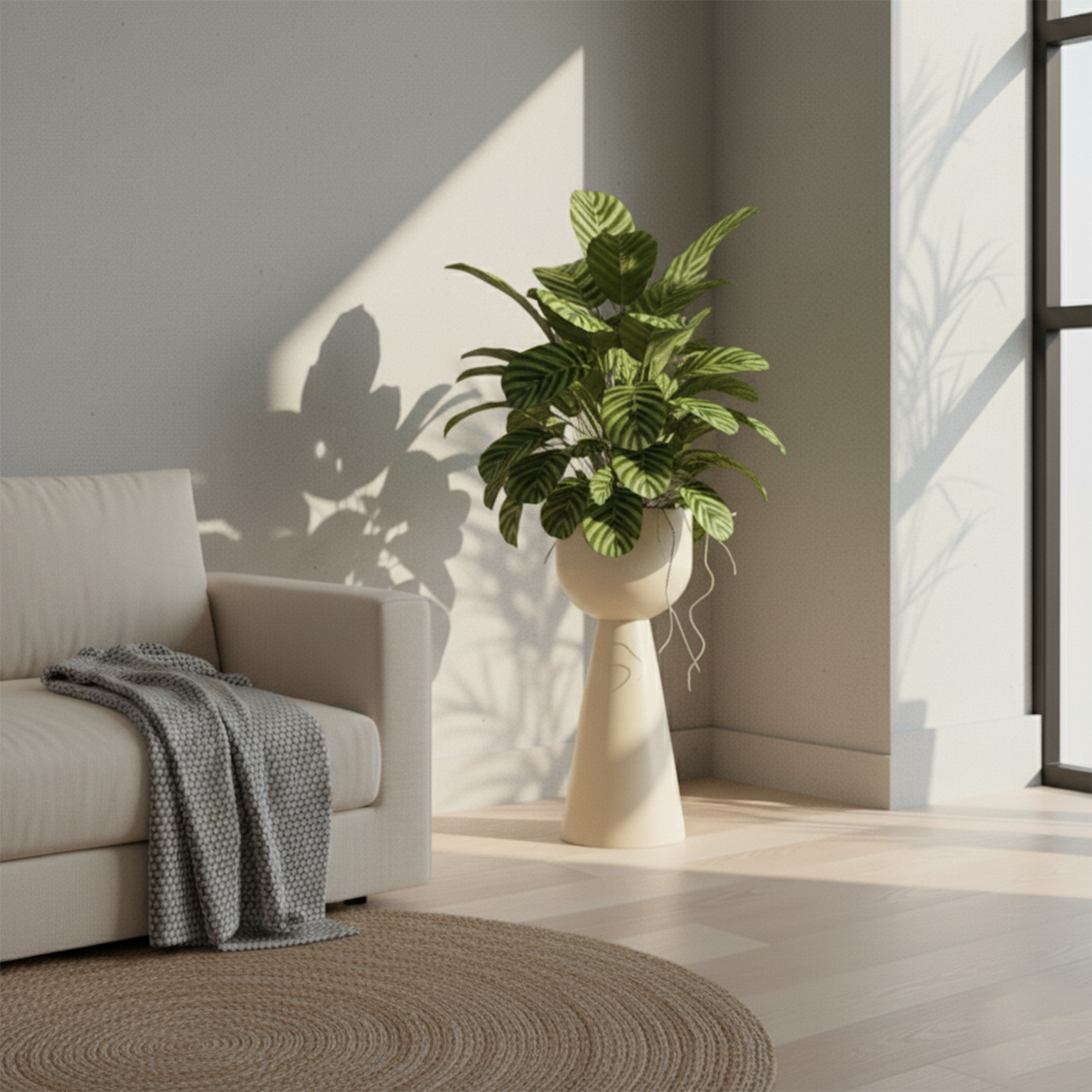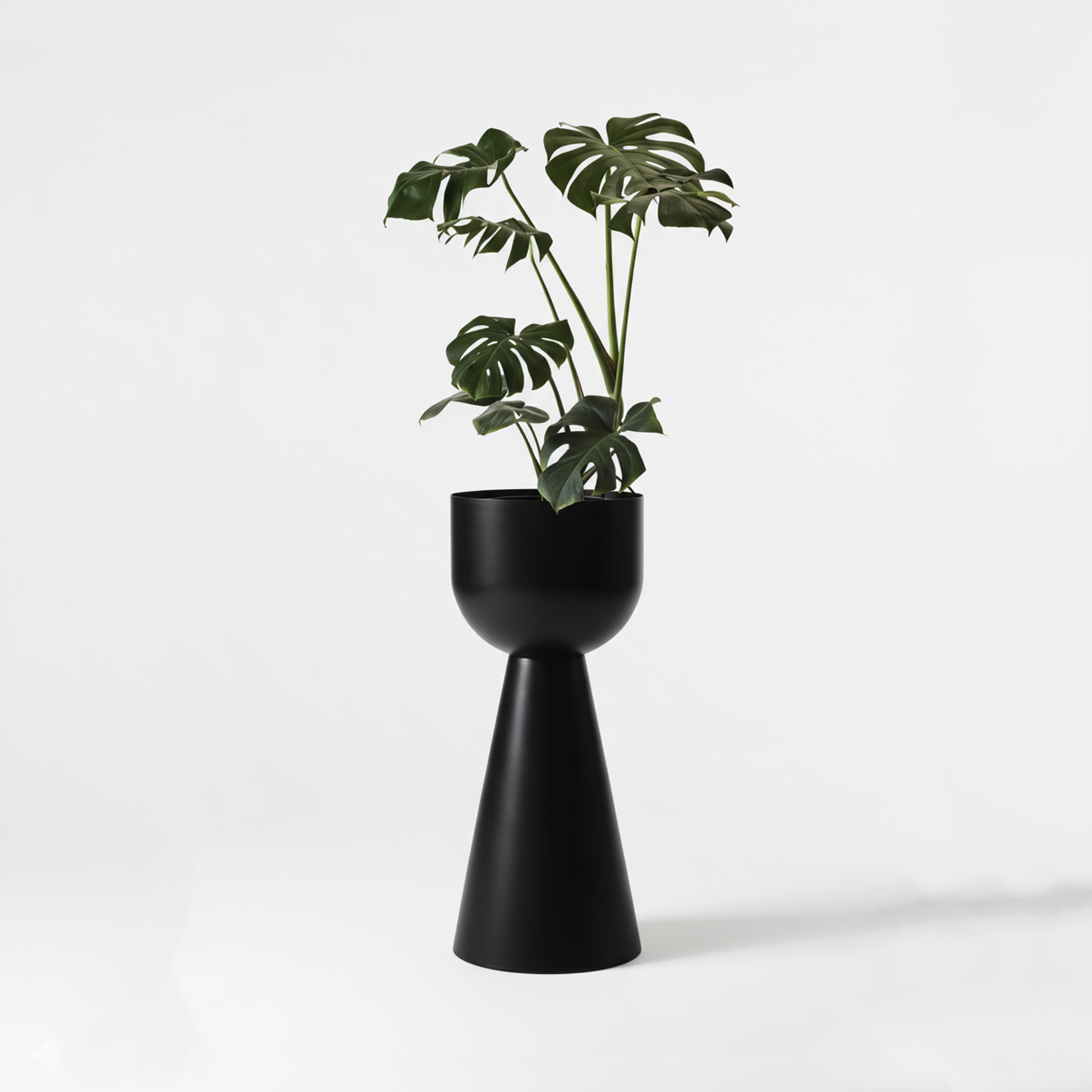 A handmade sculptural planter designed with a sleek, modern silhouette. Made from lightweight yet durable fiberglass and finished with a smooth deco paint coating, it is built to withstand time and the elements, making it ideal for both indoor and outdoor settings.